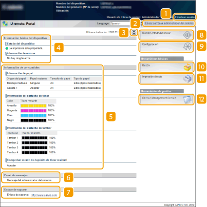 Muestra información sobre el papel (cantidad restante, tamaño, etc.) y sobre el estado de los cartuchos de tóner y otros consumibles.