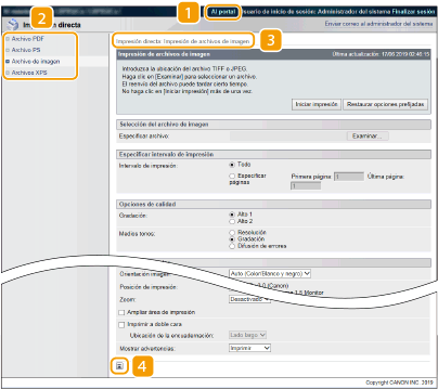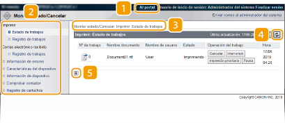 Muestra la página [Monitor estado/Cancelar]. Puede usar esta página para comprobar el estado de impresión actual, cancelar la impresión y ver un historial de los trabajos de impresión.