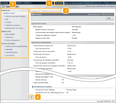 Menú en la página [Configuración]Puede cambiar las opciones en la página [Configuración] solo cuando haya iniciado una sesión en modo Administración. Si inicia una sesión en el Modo de usuario general, no aparecerán [Menú Utilidad], [Calibración], [Control de dispositivo], [Gestión de ID de departamentos] ni [Importar/Exportar]. |