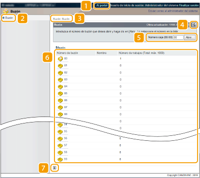 Muestra la página [Buzón]. Puede imprimir y eliminar los documentos guardados en el equipo.