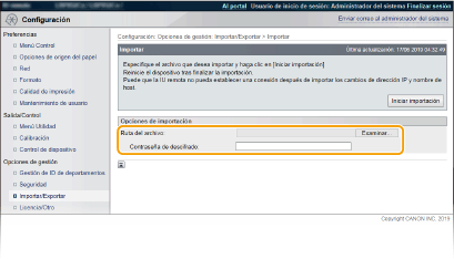 Especifique el archivo de configuración que desee importar e introduzca la contraseña.