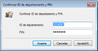 Inicio de sesión en el equipoCuando intente imprimir desde un ordenador con la Administración de ID de departamento habilitada, aparecerá la siguiente pantalla emergente (a menos que la casilla de verificación esté desmarcada [Confirmar ID de departamento/PIN al imprimir]): | | |