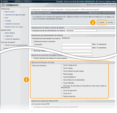 Puede seleccionar la casilla de verificación para bloquear la tecla correspondiente aunque se pulse en el panel de control. Para desbloquear la tecla, quite la marca de la casilla de verificación. También puede bloquear la tecla de Configuración desde el panel de control (