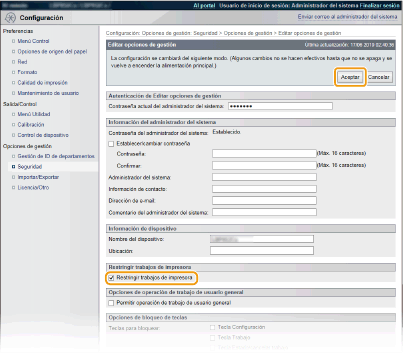 Aunque las operaciones de impresión estén restringidas, se pueden imprimir listas de opciones e informes. Impresión de informes y listas |