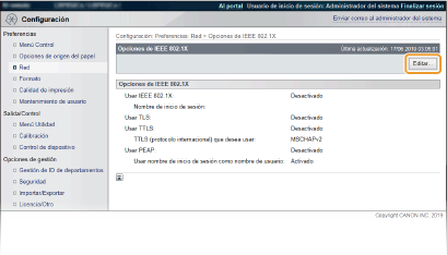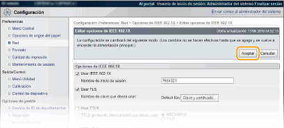 Uso del panel de controlTambién puede habilitar o deshabilitar la autenticación IEEE 802.1X desde el menú de configuración del panel de control. IEEE802.1X |