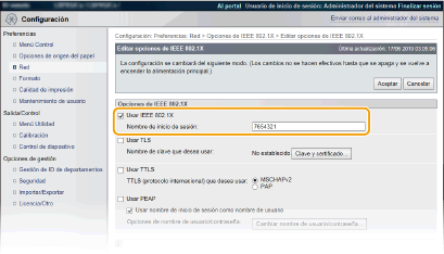 Seleccione la casilla de verificación [Usar IEEE 802.1X], introduzca el nombre de inicio de sesión en el cuadro de texto [Nombre de inicio de sesión] y especifique las opciones necesarias.