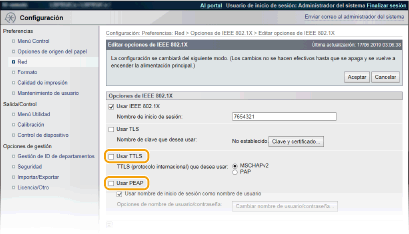 Este método de autenticación utiliza un nombre de usuario y una contraseña para la autenticación del cliente y un certificado de CA para la autenticación del servidor. Puede seleccionar MSCHAPv2 o PAP como protocolo interno. TTLS puede utilizarse con PEAP al mismo tiempo. Habilite TLS para la IU Remota antes de configurar este método de autenticación (