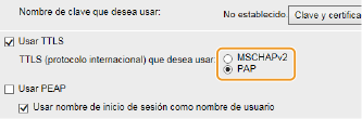 1 | Seleccione la casilla de verificación [Usar TTLS] o [Usar PEAP]. Protocolo interno para TTLS Podrá seleccionar MSCHAPv2 o PAP.Si desea utilizar PAP, haga clic en el botón de opción [PAP]. |