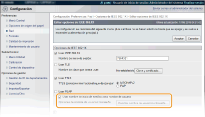 Las opciones necesarias son casi las mismas que las de TTLS. MS-CHAPv2 se utiliza como protocolo interno. Habilite TLS para la IU Remota antes de configurar este método de autenticación (