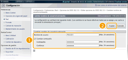 3 | Configure el nombre de usuario/la contraseña y haga clic en [Aceptar]. [Nombre de usuario] Utilice caracteres alfanuméricos para escribir el nombre de usuario. [Cambiar contraseña] Para configurar o cambiar la contraseña, marque la casilla de verificación y utilice caracteres alfanuméricos para escribir la contraseña nueva en los cuadros de texto [Contraseña] y [Confirmar]. |