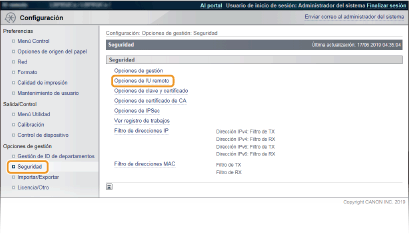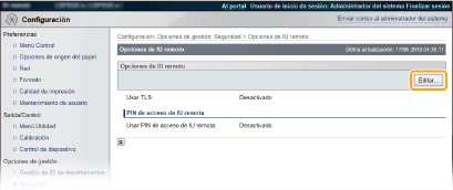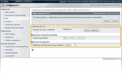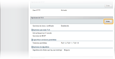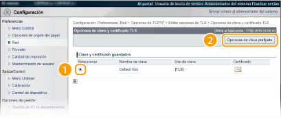 Cuando TLS ya está habilitado por [Opciones de IU remoto] o [Opciones de impresión IPP], [Opciones de clave prefijada] no aparecerá. Para cambiar la clave para utilizar, consulte el paso 6 y quite la marca de las casilla de verificación [Usar TLS] en [Opciones de IU remoto] o [Opciones de impresión IPP], respectivamente.