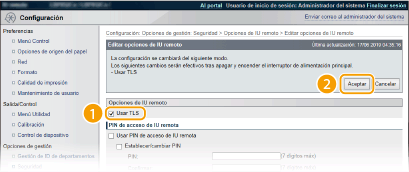 3 | Seleccione la casilla de verificación [Usar TLS] y haga clic en [Aceptar]. [Usar TLS] Si utiliza TLS para la comunicación con la IU remota, seleccione la casilla de verificación. Si no lo usa, quite la marca de la casilla de verificación. |