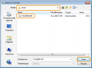 4 | Määritä kansio, jossa lisäajurit ovat, valitse INF-tiedosto ja napsauta [Avaa]. ![]() Valitse kansio seuraavasti tulostuspalvelimen käyttöjärjestelmän mukaan. Jos tulostuspalvelimessa on 32-bittinen käyttöjärjestelmä Valitse [UFR II]-kielesi-[x64]-[Driver]-kansio User Software CD-ROM/DVD-ROM. Jos tulostuspalvelimessa on 64-bittinen käyttöjärjestelmä Valitse [UFR II]-kielesi-[32BIT]-[Driver]-kansio User Software CD-ROM/DVD-ROM. | ||||||