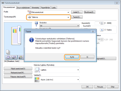 Valitse [Tallenna] kohdassa [Tulostustapa] ja napsauta [Kyllä].