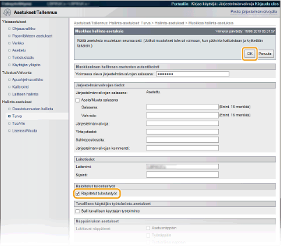 Vaikka tulostustoimenpiteitä olisi rajoitettu, asetusluetteloja ja raportteja voidaan tulostaa. Raporttien ja luetteloiden tulostaminen |