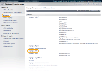 SMB prend uniquement en charge NetBIOS sur TCP/IP et ne prend pas en charge NetBEUI. Configurez l'adresse IP avant de configurer les réglages SMB. Définition des adresses IPSMB n'est activé que si la carte SD en option est installée dans l'appareil. |