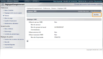 Utilisation du panneau de commandeVous pouvez aussi activer ou désactiver le serveur SMB depuis le menu des réglages du panneau de commande. SMBVous pouvez aussi activer ou désactiver l'impression SMB depuis le menu des réglages du panneau de commande. SMB |