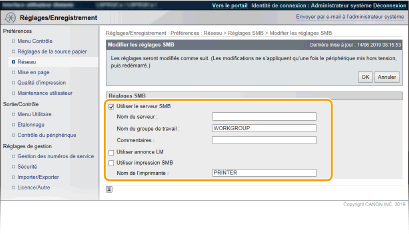 Cochez la case [Utiliser le serveur SMB] et définissez les réglages requis.