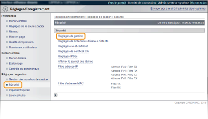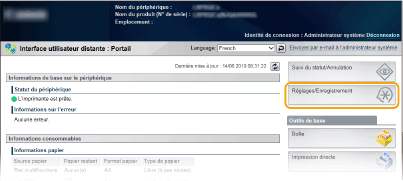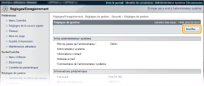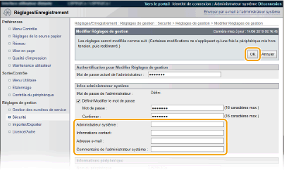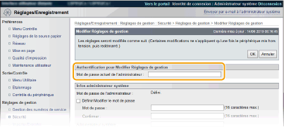 La modification des réglages de l'appareil depuis l'interface utilisateur distante nécessite des droits d'administrateur. Suivez la procédure décrite ci-dessous pour changer le mot de passe d'administrateur système. Les informations de paramétrage du mot de passe d'administrateur système étant essentielles à la sécurité de l'appareil, assurez-vous que seuls les administrateurs connaissent le mot de passe d'administrateur système.