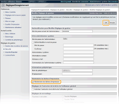 Cochez cette case pour restreindre les opérations d'impression de l'appareil. Décochez-la pour annuler la restriction.