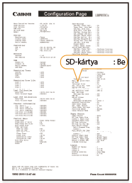 Nyomtassa ki a Konfigurációs oldal-t. Az SD-kártya megfelelően lett telepítve, ha a „Vezérlő menü” „SD-kártya” menüpontja „Be” értékre van állítva. ![]() Ha nincs információ az SD-kártya állapotáról Az SD-kártya nincs megfelelően telepítve. Távolítsa el az SD-kártyát a készülékből, majd helyezze be újra. | ![]() |