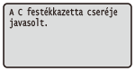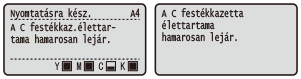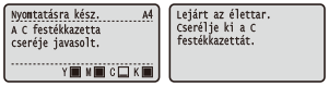 Amikor közeledik a festékkazetta cseréjének ideje, üzenet jelenik meg a kijelzőn. Ne feledje, hogy ha ekkor minden intézkedés nélkül folytatja a nyomtatást, romlik a nyomtatás minősége. Ellenőrizheti a festékkazetta állapotát a kijelzőn.