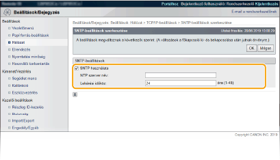 Jelölje be a [SNTP használata] jelölőnégyzetet, és adja meg a szükséges beállításokat.