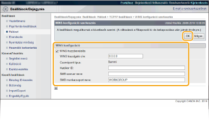 Ha a WINS-kiszolgálónak DHCP-kiszolgáló ad IP-címet, akkor a kapott IP-cím felülbírálja a [WINS kiszolgáló cím] szövegmezőben megadott IP-címet.