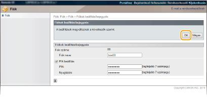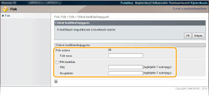 PIN-kód megadásához jelölje be a [PIN beállítás] a jelölőnégyzetet, és adjon meg egy számot a [PIN] szöveges mezőben. A beállítás megerősítéséhez adja meg ugyanazt a számot a [Nyugtázás] szöveges mezőben.