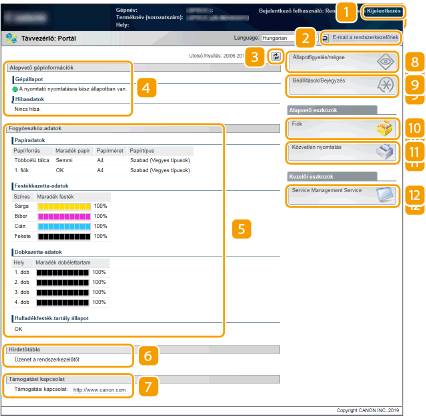 Megjeleníti a készülék aktuális állapotát és a hibainformációkat. Ha hiba történt, akkor megjelenik a Hibainformációk oldalra mutató hivatkozás.