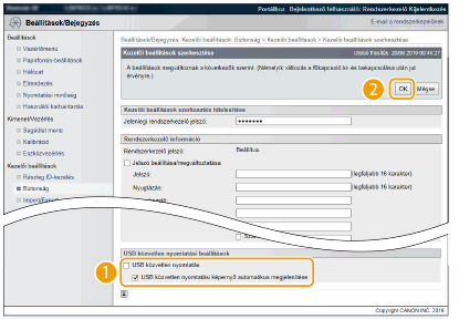 A jelölőnégyzetben lévő jel törlésével letiltja az USB-memóriaeszközről történő nyomtatást, a jelölőnégyzet bejelölésével pedig engedélyezi azt. Ha bejelöli az [USB közvetlen nyomtatási képernyő automatikus megjelenítése] jelölőnégyzetet is, akkor a közvetlen USB-nyomtatás képernyője automatikusan megjelenik, ha USB-memóriaeszköz csatlakozik a készülékhez.