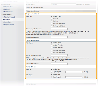 Ha a [IPv4 kézi beállítások] vagy a [IPv6 kézi beállítások] lehetőség van kiválasztva a [Távoli cím] mezőben, akkor adja meg azt az IP-címet, amelyre alkalmazni kell a házirendet.