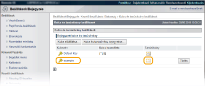 Ha egy kulcspárt használja valamilyen funkció, például a [Kulcs használata] mezőben a TLS vagy az IEEE 802.1X lehetőség van kiválasztva, akkor nem törölhető. Ebben az esetben a kulcspár törlése előtt ki kell kapcsolni a funkciót, vagy le kell cserélnie a kulcspárt.