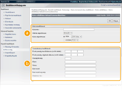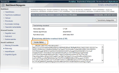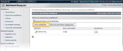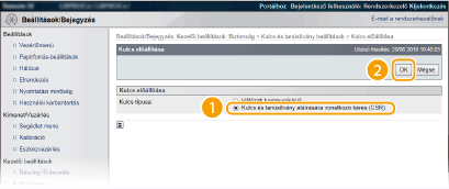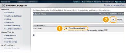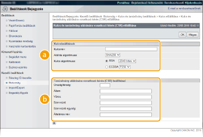 Ha a Transport Layer Security (TLS) protokollal folytatott titkosított kommunikációhoz kulcspárra van szükség, akkor az előállítható a készülékkel. A TLS protokollt a készülék Távoli felhasználói felületen keresztüli elérésekor vagy IPP-nyomtatáskor használhatja. A készülékre legfeljebb nyolc kulcspár jegyezhető be, beleértve az előre telepített kulcspárt is. Az önaláírt tanúsítványok a „Hálózati kommunikáció” típussal létrehozott kulcspárokkal használhatók. „Kulcs és tanúsítvány-aláírási kérelem (CSR)” esetében a készülékkel létrehozott kulcspárhoz kérhet hitelesítésszolgáltató által kiállított digitális tanúsítványt.