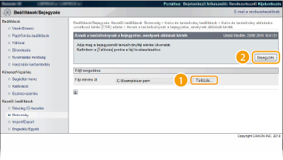 Kattintson a [Tallózás] elemre a [Fájl elérési út] pontban, adja meg a fájlt a tanúsítvány-aláírási kérelemhez, majd kattintson a [Bejegyzés] lehetőségre.