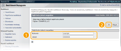 2 | Adja meg a kulcspár nevét és a jelszót, majd kattintson az [OK] gombra. [Kulcsnév] Adjon meg egy alfanumerikus karakterekből álló nevet a bejegyzendő kulcspárnak. [Jelszó] Adjon meg egy alfanumerikus karakterekből álló jelszót a bejegyzendő fájlhoz tartozó privát kulcskészlet számára. |