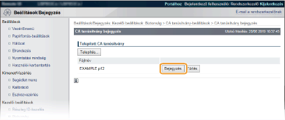 A készülékkel használni kívánt kulcspárok és digitális tanúsítványok hitelesítésszolgáltatóktól szerezhetők be. A fájlokat mentheti a számítógépre, majd bejegyezheti a Távoli felhasználói felülettel. Győződjön meg róla, hogy a kulcspár és a tanúsítvány megfelel a készülék által támasztott követelményeknek (