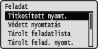 ![]() | Kinyomtathatja az SD-kártyán tárolt dokumentumokat és a nyomtatási naplót. A kezelőpanel ( ) gombjának megnyomásakor megjelenik a Feladatok menü. Az alább ismertetett beállításokat a készülék offline állapotában adhatja meg. |