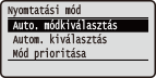 Automatikus kiválasztási mód | A készülék akkor lép automatikus kiválasztási módba, ha az <Autom. kiválasztás> értéket választotta az <Auto. módkiválasztás> beállításban. A készülék automatikusan megkülönbözteti a számítógépről küldött adatokat, és kiválasztja a nyomtatási módot. Ezt a nyomtatási módot akkor használja, ha alkalmazásból nyomtat. |