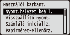 ![]() | Rövid leírás kíséretében ismertetjük a készülék beállítási lehetőségeit, többek között a nyomtatási pozíciónak az egyes papírforrásokhoz történő kiigazítását, valamint a nyomtatási minőség javítását. Ezeket a beállításokat a készülék offline állapotában adhatja meg. Az alapértelmezett beállítások mellett a ( ) jelzés látható. |