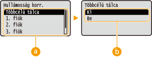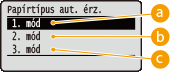 Ez a beállítás akkor használható, ha a Adagolóválasztás menü pontban az <Papírtípus aut. érz.> nem <Ne használja> értékre van állítva. Amennyiben a gyári alapbeállítást bármely más értékre állítja, előfordulhat, hogy az automatikus papírtípus-felismerés nem működik megfelelően. |