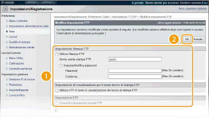 Selezionare la casella di controllo per consentire di modificare le impostazioni della macchina tramite client FTP. Se le modifiche alle impostazioni non sono ammesse, deselezionare la casella di controllo.