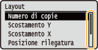 È possibile specificare varie impostazioni relative alla visualizzazioni, quali la regolazione dello schermo e la lingua, usando <Menu Controllo> nel menu delle impostazioni del pannello operativo. Menu Controllo |