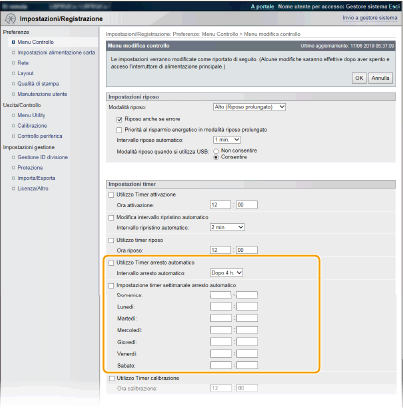 Selezionare la casella di controllo per spegnere la macchina una volta trascorso il tempo indicato in [Intervallo arresto automatico].