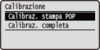 Sebbene di solito il tipo di calibrazione che viene eseguita in automatico è uguale a <Calibraz. completa>, è possibile modificare con <Calibraz. stampa POP>. Calibraz. POP auto |
