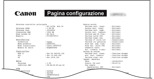 Menu Configurazione), i contenuti registrati nella macchina e altre informazioni in formato elenco. Le altre informazioni includono lo stato delle cartucce di toner, il numero di pagine stampate e la capacità della memoria (RAM) installata nella macchina. Le impostazioni il cui nome è preceduto da un asterisco (