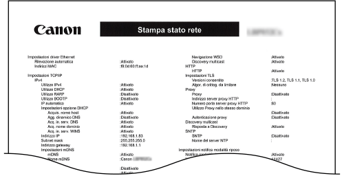 Rete), in formato elenco. Vengono inoltre stampate le informazioni sulla sicurezza, incluse le impostazioni del filtro indirizzi e le impostazioni IPSec.