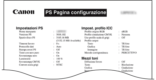 Vengono stampate in formato elenco le impostazioni per usare la modalità PS e le informazioni interne registrate nella macchina.