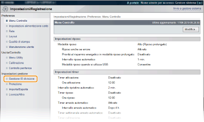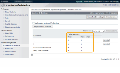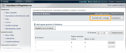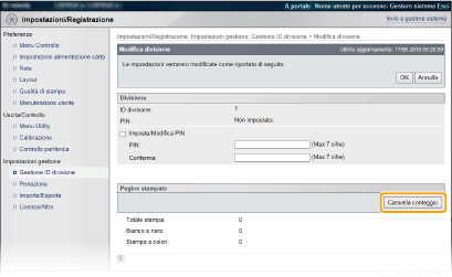 Per stampare il risultato del controlloPer azzerare il conteggio delle pagineQuando si vuole azzerare il conteggio delle pagine di un singolo reparto, fare clic sul collegamento di testo sotto [ID divisione] e poi fare clic su [Cancella conteggio]  [OK]. Se si vogliono azzerare i conteggi di tutti i dipartimenti, fare clic su [Cancella tutti i conteggi]  [OK]. |