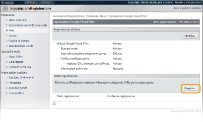 Occorre abilitare Google Cloud Print. Fare clic su [Modifica], selezionare la casella di controllo [Utilizza Google Cloud Print] e fare clic su [OK].